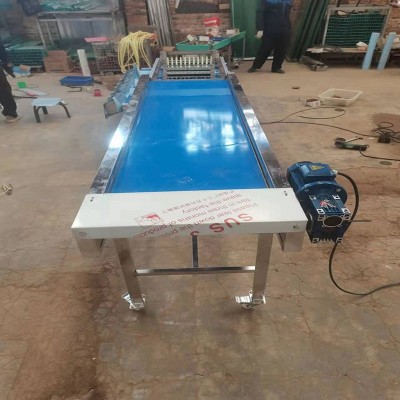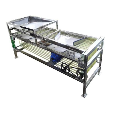 選果機(jī)的傳送帶選用硅橡膠材料制作,韌性好,克服了傳送帶易裂、易斷、易老化的弊端,軌道槽堅(jiān)固、不易變形;V型槽之間用嚙齒軸套相隔,可方便調(diào)整傳送帶的間距,達(dá)到了一機(jī)多用的效果(圣女果、蒜米、新疆大棗、灰棗、金絲小棗、山楂、沙棘、金桔、沙糖桔、荔枝、龍眼等小型果蔬果實(shí)),機(jī)身長度增加到三米,可以根據(jù)果蔬直徑大小將果蔬分成4-7個(gè)等級,選果均勻、等級分的細(xì)。針對怕傷皮的果品篩選的過程中不容易損傷果皮,篩選效果均勻。