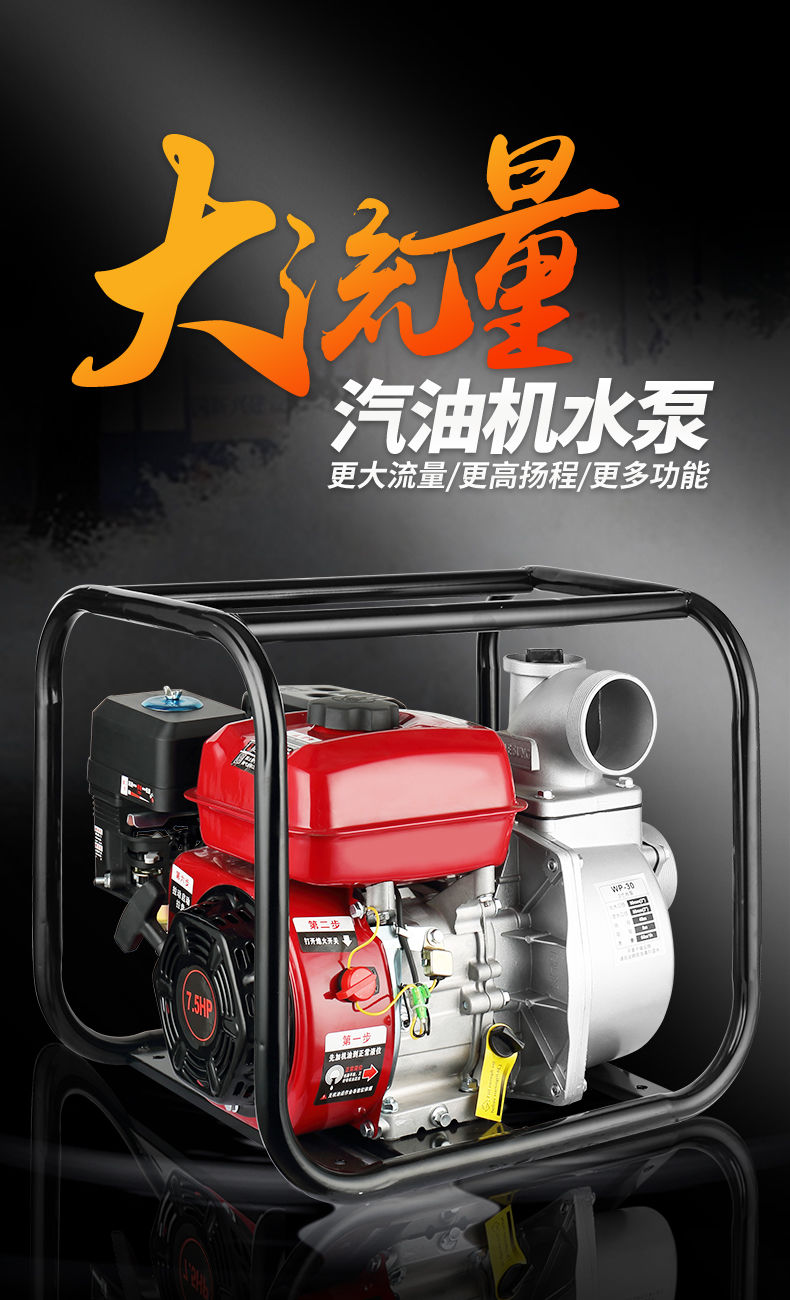 使用前請加入四沖程汽機油:0.6升,郵箱內汽油不能加的太滿,泵內無水禁止啟動,不用時很好把泵體內的水放凈,以免腐蝕泵體,詳細閱讀說明書。用鋼凸輪軸發動機,動力大且很省油,是您理想的選擇。