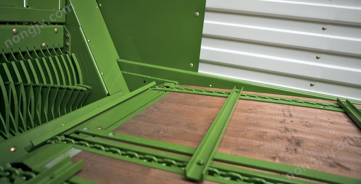 所有刀片的更換無需工具。從機械一側拉出刀架即可逐一取下刀片。這一創(chuàng)新的設計無疑為設備的使用人員帶來了更高的作業(yè)舒適性。和刀片及刀架有關的所有操作都可以在機械左側進行,節(jié)省了寶貴時間,提高了工作效率。 | 我們將帶傳動鏈的活動車廂底板作出了向前傾斜的設計,如此一來物料運行更順暢和迅速,不但減少了前方輸送系統(tǒng)的負荷,也降低了整車的動力需求。經實踐證明我們的AX拖車只需80Hp的拖拉機牽引就能正常開展作業(yè)。優(yōu)異的撿拾切碎質量-極小的動力需求:這種看似矛盾的理想化搭配真實在AM系列機械上得以體現(xiàn)。 |