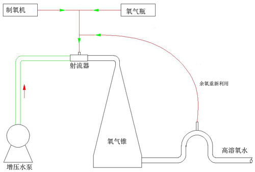 氧氣錐是一種特殊的壓力容器。它的主要功能就是在氣液充分混合的條件下,增加壓力來迫使氣體克服水的表面張力而被動(dòng)溶解。因此氧氣錐要與增壓泵、射流器等設(shè)備配套使用。氣源采用制氧機(jī)或氧氣瓶(氧氣純度大于90%)