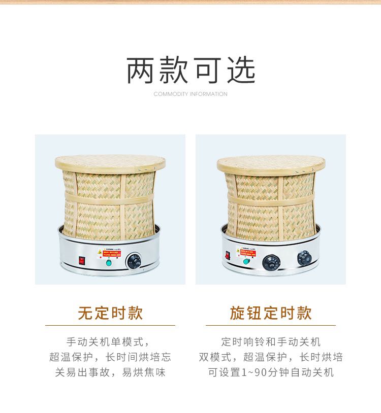 系統默認款式二篩子(鐵絲網篩)需要其他款式篩子,請聯系客服。13599233116 【多功能家用商用提香機】 茶店,茶樓,居家,酒樓好幫手--傳統無碳茶葉電焙籠,可烤綠茶,花茶,鐵觀音,紅茶,大紅袍等各種茶葉 【特點】 1.可降低茶葉含水量,但茶葉仍保侍清香口味,而不含烤火味. 2.烘過的茶葉不會變色. 3.提升茶葉香氣,色澤,口感. 4.延長茶葉保質時間. 5.機身體積小巧,不占空間,重量輕,移動方便,適合各種不同場所. 放在家中,酒店,茶樓,公司,店里等場所烘焙茶葉中,茶香四溢,能吸引顧客聞香上門;現焙現賣,延長茶葉保鮮時間,體現質量對顧客負責。多功能無炭茶葉電烘焙提香機竹編機體回歸傳統碳焙工藝。