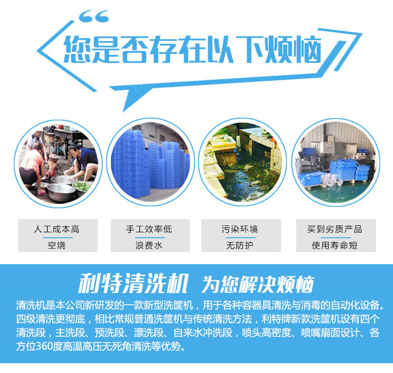 我們的洗筐機(jī)一般采用6米長制作,分為四段清洗,預(yù)洗、主洗、漂洗和沖洗,根據(jù)客戶的要求后面可加吹干機(jī),可進(jìn)行對筐子、托盤等的吹干