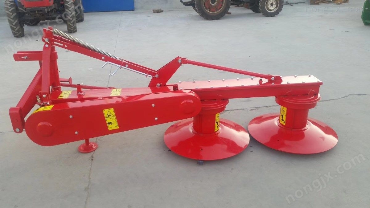 后置雙盤割草機,主要用于各類牧草的收割。采用割草機連接到拖拉機后側懸掛牽引架,以動力輸出軸帶動作業。該機有兩個高速旋轉刀盤,每個刀盤上裝有叁把刀片,可高速作業達每小時15畝,生產率高