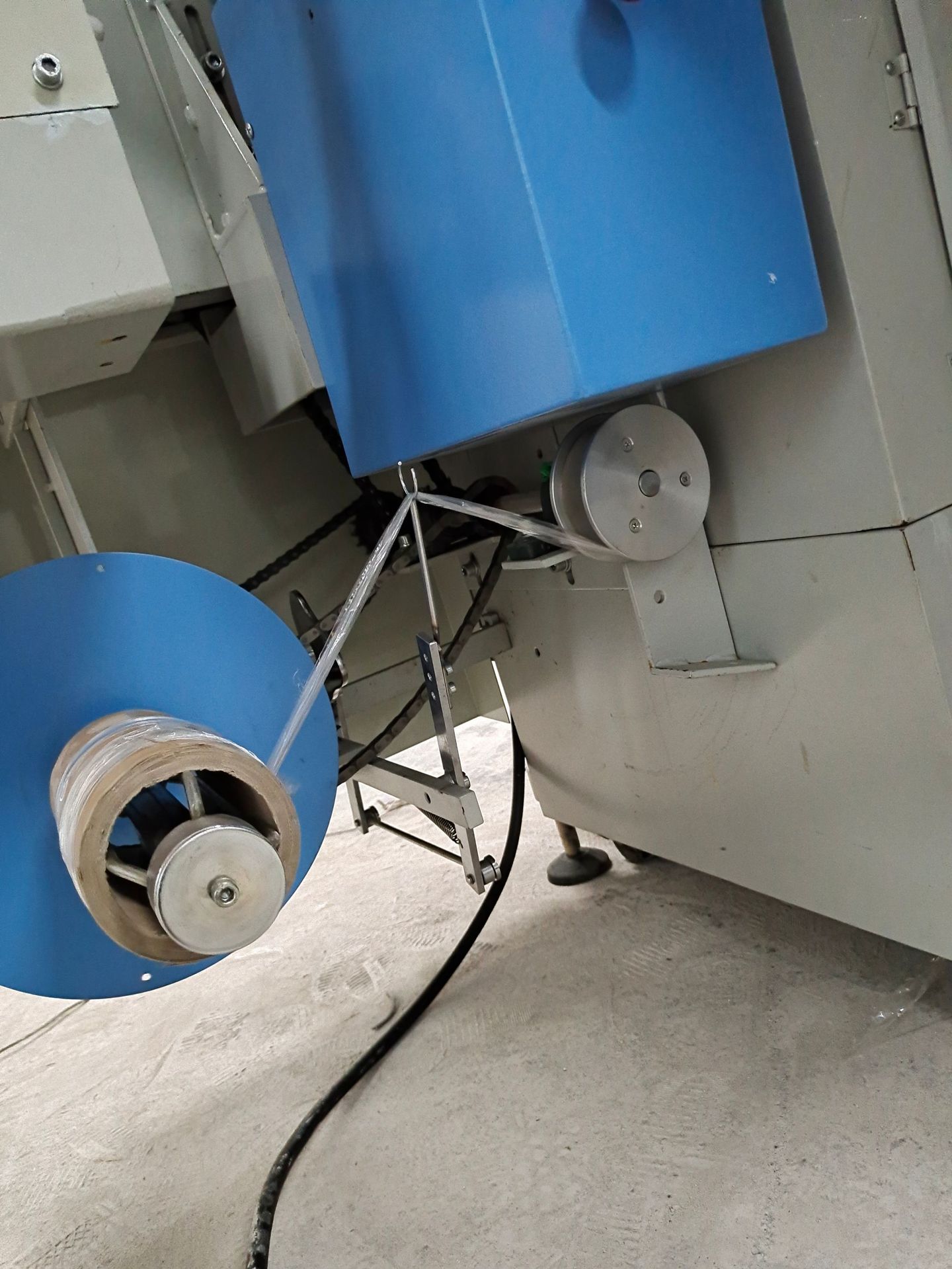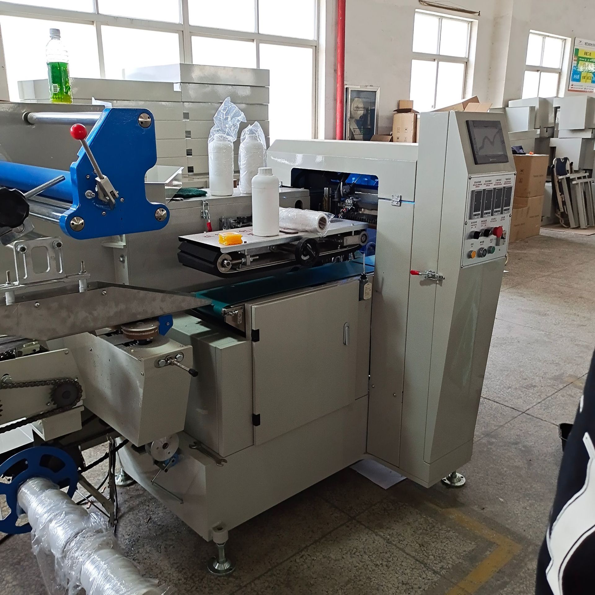 封切出來的廢料邊從下方自動收集;包好的產品經后道小輸送臺自動進入對接的熱收縮