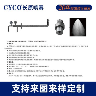 1、CDE系列噴槍上的噴嘴使用大流量的空氣霧化型噴嘴,擁有多級霧化效果,在火力發電廠除塵脫硫脫硝,化工廠、水泥廠和除塵環保工程都有廣泛應用;