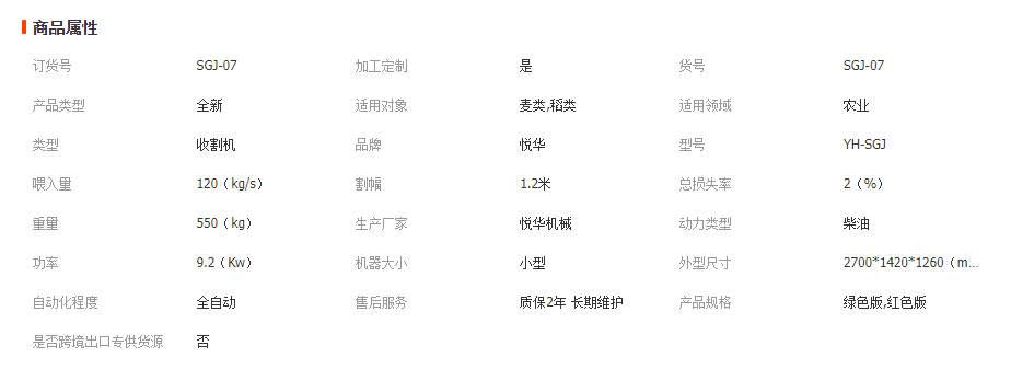 履帶式聯合收割機 技術參數:小麥水稻聯合收割機 外形尺寸:2700*1420*1350MM 包裝尺寸:2200*1320*1260MM 生產效率:1-1.8畝/小時 整機重:550KG 割幅寬度:1米 喂入量:0.8KG/S 最低留茬:12公分 配套動力:常聯發H15馬力水冷柴油機 油耗:0.9-1.47升/畝 悅華機械設備銷售電話 15964112032 0537-4590789