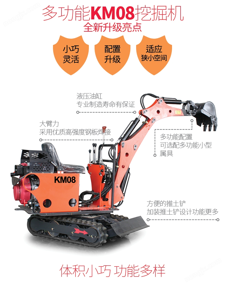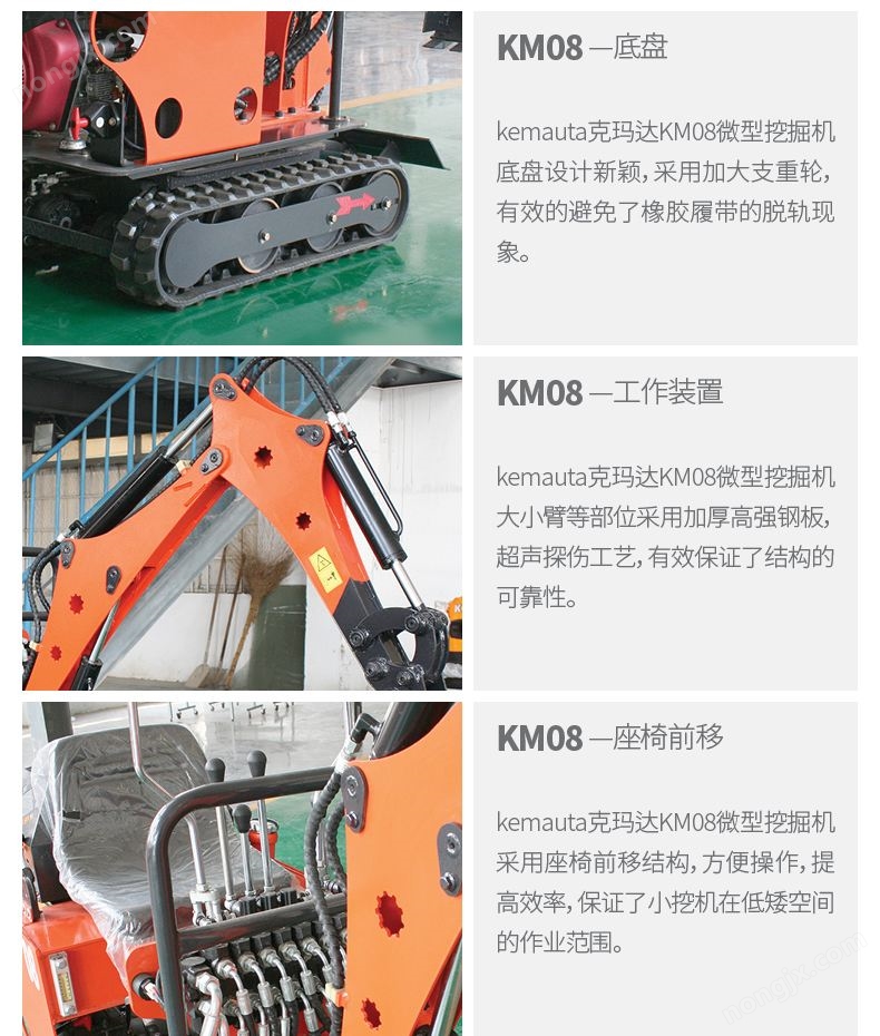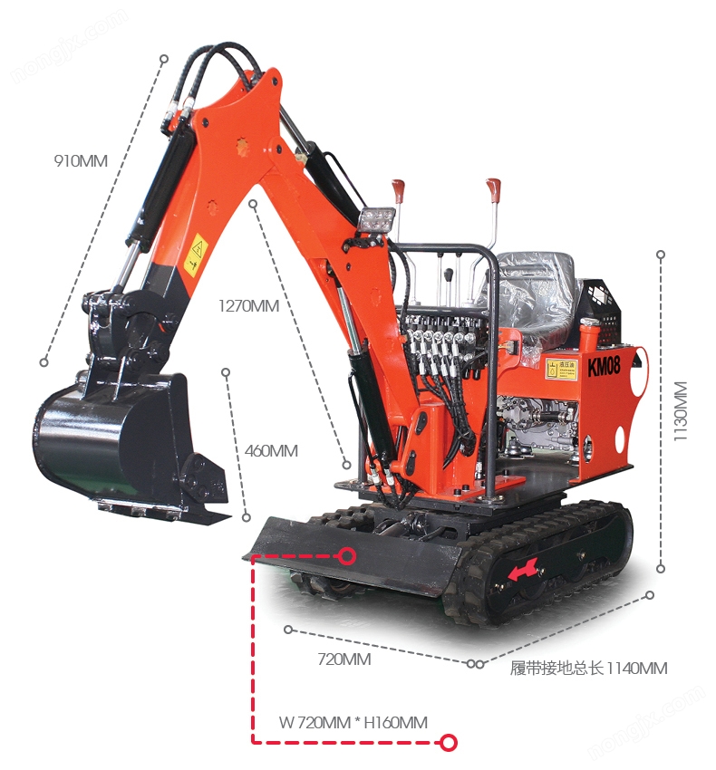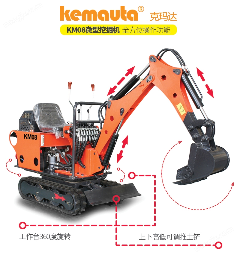 微型履帶式挖掘機KM08專為低矮狹小空間設計,該小挖機寬度720mm,高度1250mm,機身尺寸緊湊;應用領域廣泛,例如:葡萄園、果園、蔬菜大棚、室內等狹小空間;人性化設計,設計簡便,初學者上手快,維修保養極其方便;耗油量低,降低作業成本,解放勞動力,提高工作效率,低投資、*。
