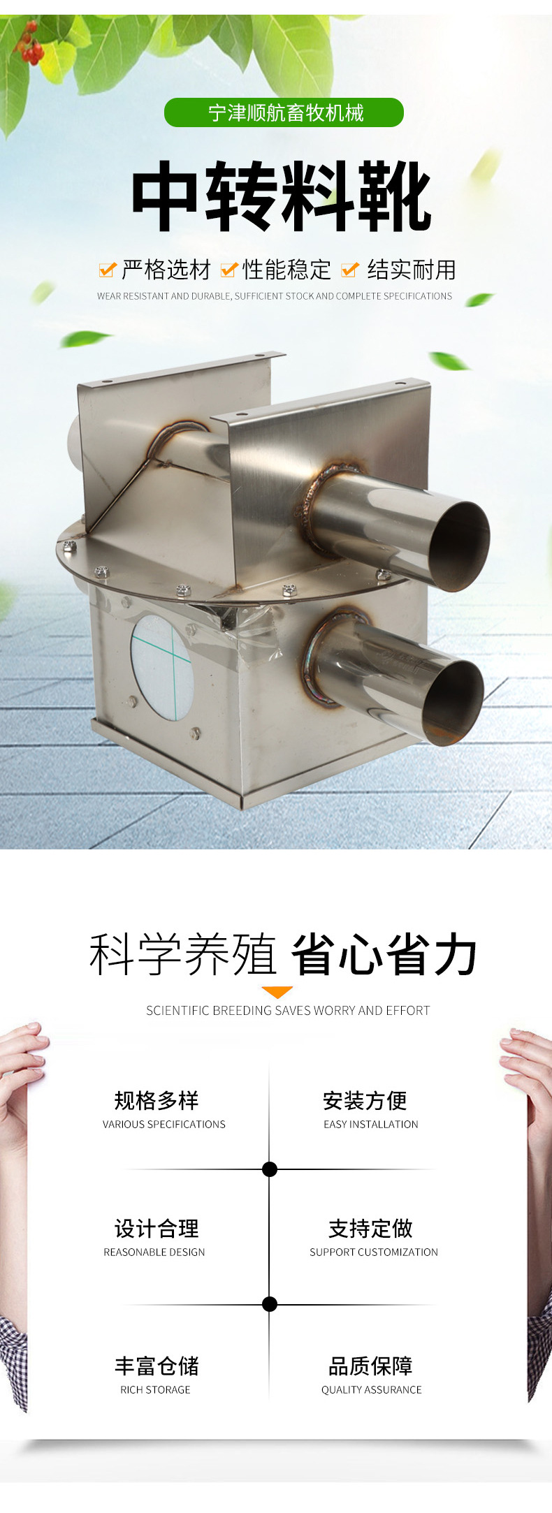 詳細(xì)信息 商品屬性 訂貨號 122502 加工定制 是 貨號 SH-中轉(zhuǎn)料靴02 適用對象 兔,牛,雞,羊,蜂,馬,鵝,驢,鴨,犬,鵪鶉,豬,鴿,騾 用途 飼喂設(shè)備 品牌 順航 型號 中轉(zhuǎn)料靴 外型尺寸 詳詢客服 包裝說明 詳詢客服 控溫范圍 詳詢客服 類型 中轉(zhuǎn)料靴 產(chǎn)品類型 全新 售后服務(wù) 詳詢客服 是否跨境出口專供貨源 否