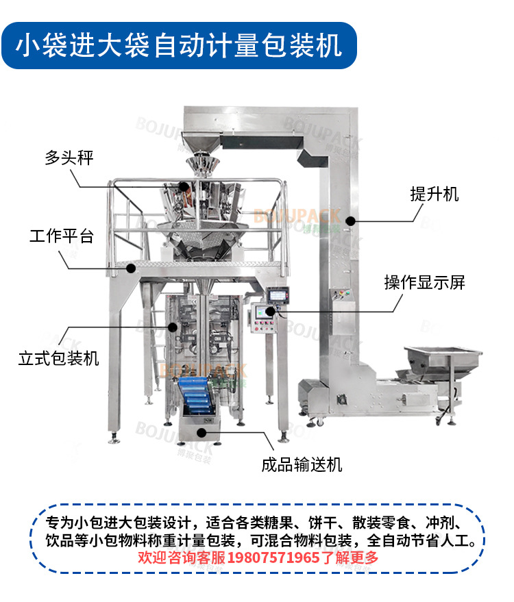 裝。通過提升機把小袋物料提升至自動計包裝置中后,電腦自動組合所設定的數量,通過包裝機自動