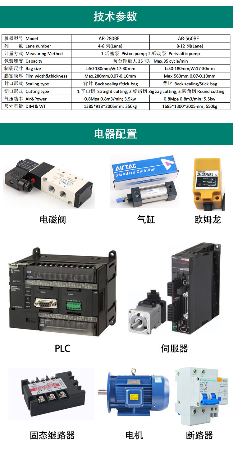 詳細信息 訂貨號119821 加工定制是 貨號110878 功能灌裝,計量,封口,打碼、噴碼 品牌澳瑞寶 型號AR-280BF 電壓220(V) 功率3.5(Kw) 包裝膜寬280(mm) 制成袋尺寸17-180(mm) 包裝速度160-480(袋/分鐘) 重量350(kg)