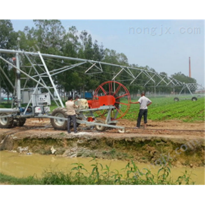 平移式噴灌機又稱連續直線自走式噴灌機,它是由指針式噴灌機發展而來。其主要是由兩臺中心支軸式噴灌機,在其中心支軸處代之以*控制塔車并成反對稱組裝而成。