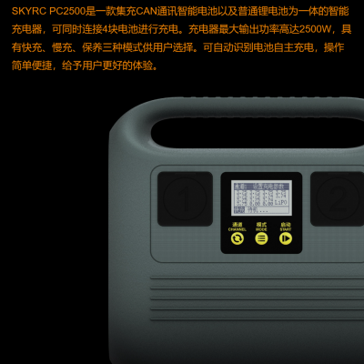 SKYRC PC2500是一款集充CAN通訊智能電池以及普通鋰電池為一體的智能充電器,可同時連接4塊電池進行充電。