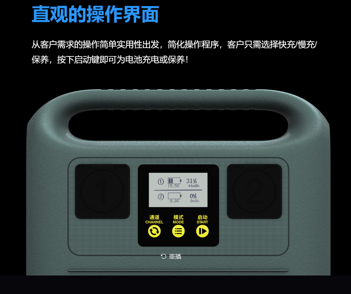 從客戶需求的操作簡單實用性出發(fā),簡化操作程序,客戶只需選擇快充/慢充/保養(yǎng),按下啟動鍵即可為電池充電或保養(yǎng)!