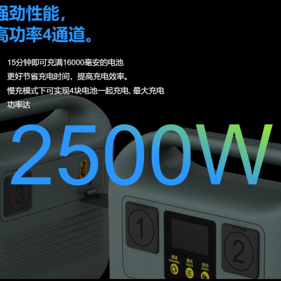 慢充模式下可實現(xiàn)4塊電池一起充電, 最大充電功率達2500W