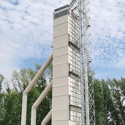 熱風系統(tǒng)采用多臺風機分段變溫烘干技術。剛入塔的糧食由于水分大、溫度低,所以第一烘干段采用高風溫、大風量進行急劇降水。這時熱風效率非常高,飽和的廢氣被迅速排出塔外,提高烘干效率,達到增產(chǎn)目的。糧食進入緩舒段進行濕熱交換,表層的熱量向內部傳導,內部的水分向表層移動,這樣能減少裂紋率,提高糧食品質。進入第二、三烘干段后,糧食溫度已達30℃以上,水分在20%以下,這時使用低溫烘干,可節(jié)省能量。冷卻段采用混逆流模式,糧食緩慢降溫,充分冷卻。