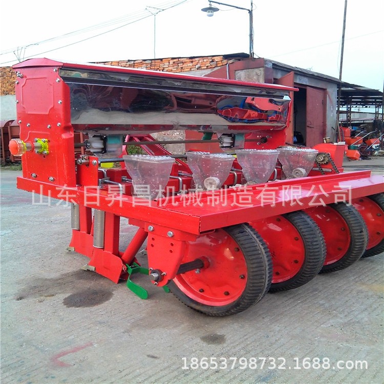 玉米播種機(jī) 一、用途與特點(diǎn) (一)用途: 該機(jī)與拖拉機(jī)配套作業(yè),主要用于免耕地單粒精播或雙粒精播玉米,可條施晶粒狀化肥,一次完成開(kāi)溝施肥、開(kāi)種溝、播種、覆土、鎮(zhèn)壓等項(xiàng)等工序,兩行機(jī)添加鋪鏌機(jī)構(gòu)可以完成地膜覆蓋。 (二)特點(diǎn): 排種器播種精度高,粒數(shù)合格指數(shù)達(dá)到80%以上。 采用法向充種,可以高速作業(yè),當(dāng)株距不小于20厘米時(shí)作業(yè)速度可達(dá)到8公里/小時(shí)。 穴距精確,幼苗分部均勻,競(jìng)爭(zhēng)小,個(gè)體優(yōu)勢(shì)能夠充分發(fā)揮,作物生長(zhǎng)旺盛,產(chǎn)量高。 配有單粒和雙粒兩種導(dǎo)種輪,當(dāng)用戶種子為精選種子時(shí)可以選擇單粒導(dǎo)種輪,實(shí)現(xiàn)一穴一粒精播,非精選過(guò)的種子可以選擇雙粒導(dǎo)種輪,實(shí)現(xiàn)一穴兩粒播種。 各行傳動(dòng)軸連成一體,統(tǒng)一驅(qū)動(dòng),轉(zhuǎn)速一至,傳動(dòng)動(dòng)力大,即使其中一行的地輪偶然打滑,也不影響該行正常播種。 整臺(tái)機(jī)器通過(guò)唯一的變速箱改變株距,可產(chǎn)生四種株距,只要改變變速箱傳動(dòng)比,就可將整臺(tái)機(jī)器的各行株距改變。 變速箱操作手桿可以同時(shí)控制擺移輪徑向擺和軸向移動(dòng),操作快捷方便,變速箱所有齒輪都選用優(yōu)質(zhì)鋼材經(jīng)過(guò)滲碳處理,各傳動(dòng)部件都選用了優(yōu)質(zhì)滾動(dòng)軸承,性能可靠。 機(jī)架距地面抬高,前后開(kāi)溝器距離加寬,緩減了夏播麥秸堵塞機(jī)器現(xiàn)象。該機(jī)與拖拉機(jī)配套作業(yè),主要用于免耕地單粒精播或雙粒精播玉米,可條施晶粒狀化肥,一次完成開(kāi)溝施肥、開(kāi)種溝、播種、覆土、鎮(zhèn)壓等項(xiàng)等工序,兩行機(jī)添加鋪鏌機(jī)構(gòu)可以完成地膜覆蓋。前面多加了2個(gè)浮動(dòng)輪【特別適合山區(qū),用,不是那么平的地】高凹不平。